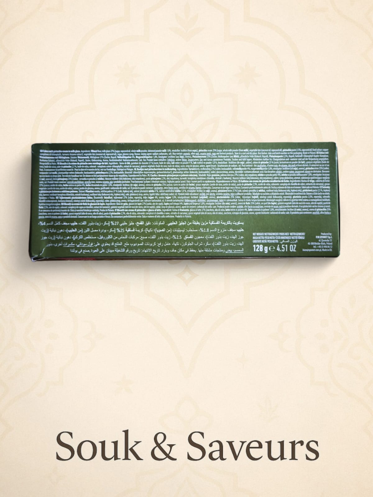 Un produit généreux et élégant, parfait pour les amateurs de chocolat à la pistache et de douceurs premium.